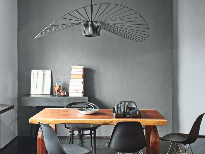 Duet szarości i czerni to wysmakowana klasyka gatunku, która doda aranżacji zdecydowanego wyrazu, cały czas uwodząc szlachetną elegancją. Minimalistyczne krzesła w czarnym kolorze zachwycą oryginalnością na tle szarej ściany, a niebanalny akcent w postaci designerskiej lampy przypominającej kształtem rondo kapelusza, jeszcze bardziej wyeksponuje unikalny styl wystroju. Przysłowiową kropką nad i będzie tradycyjny, drewniany stół, który umiejętnie złagodzi mocny charakter wnętrza i wniesie odrobinę naturalnego ciepła do pomieszczenia.
