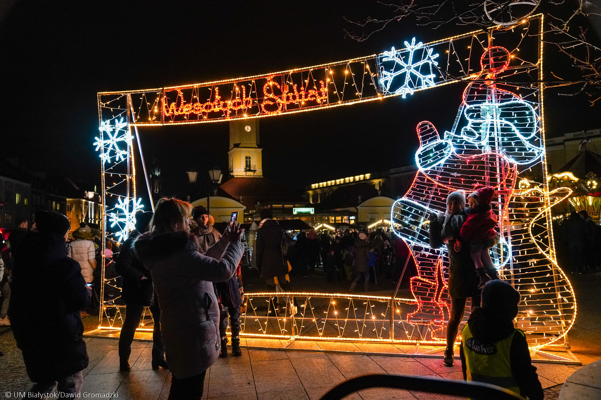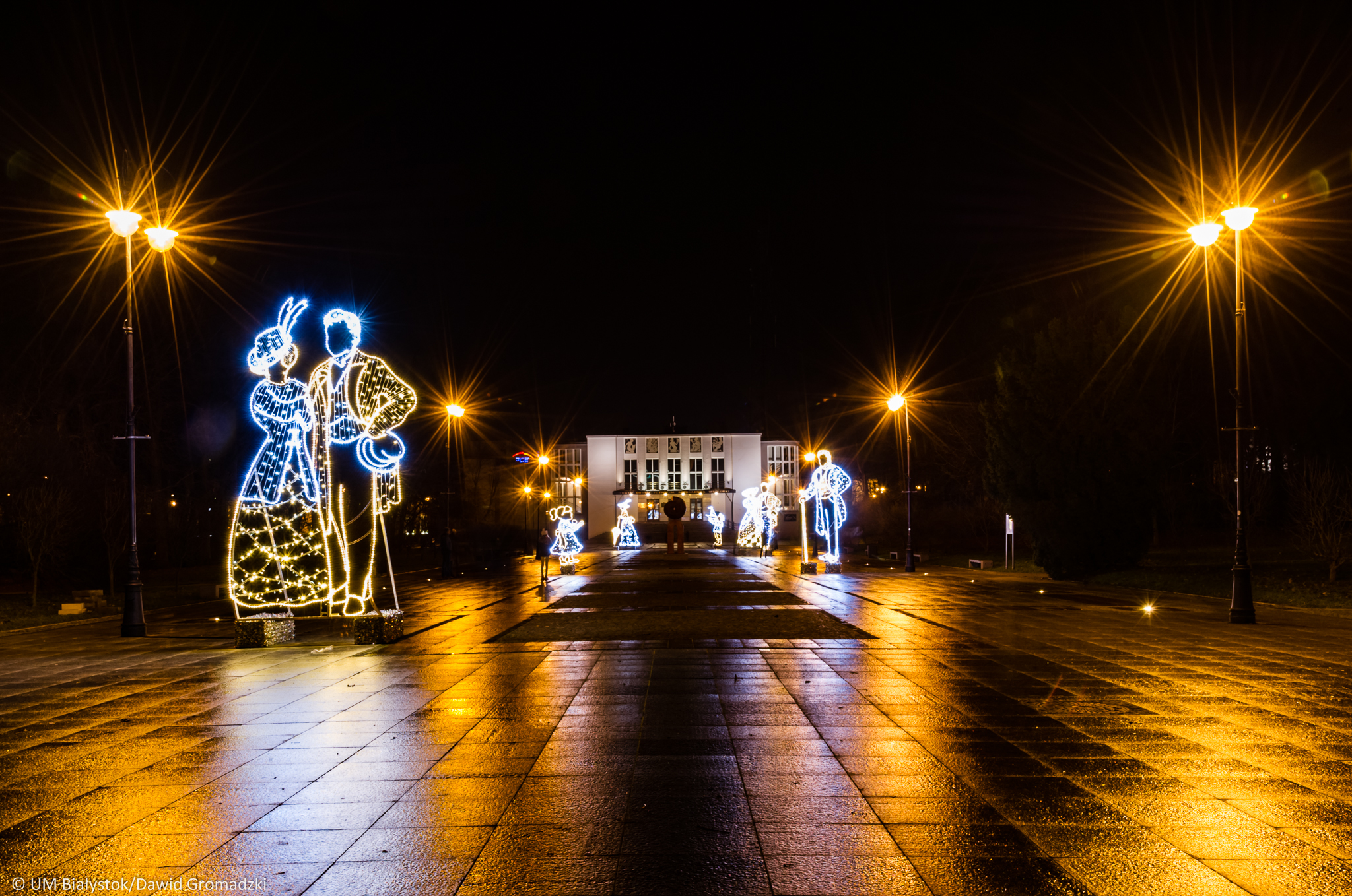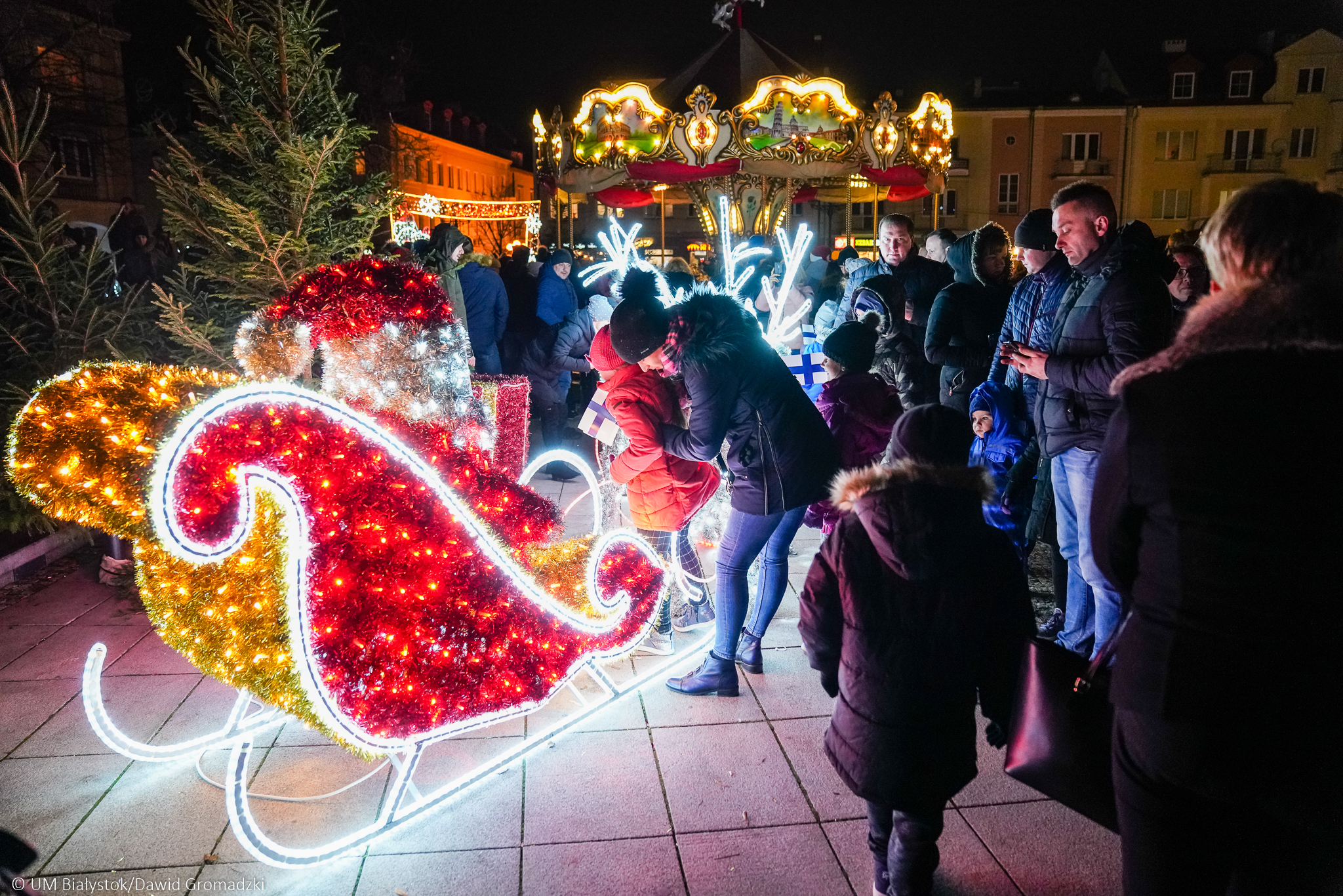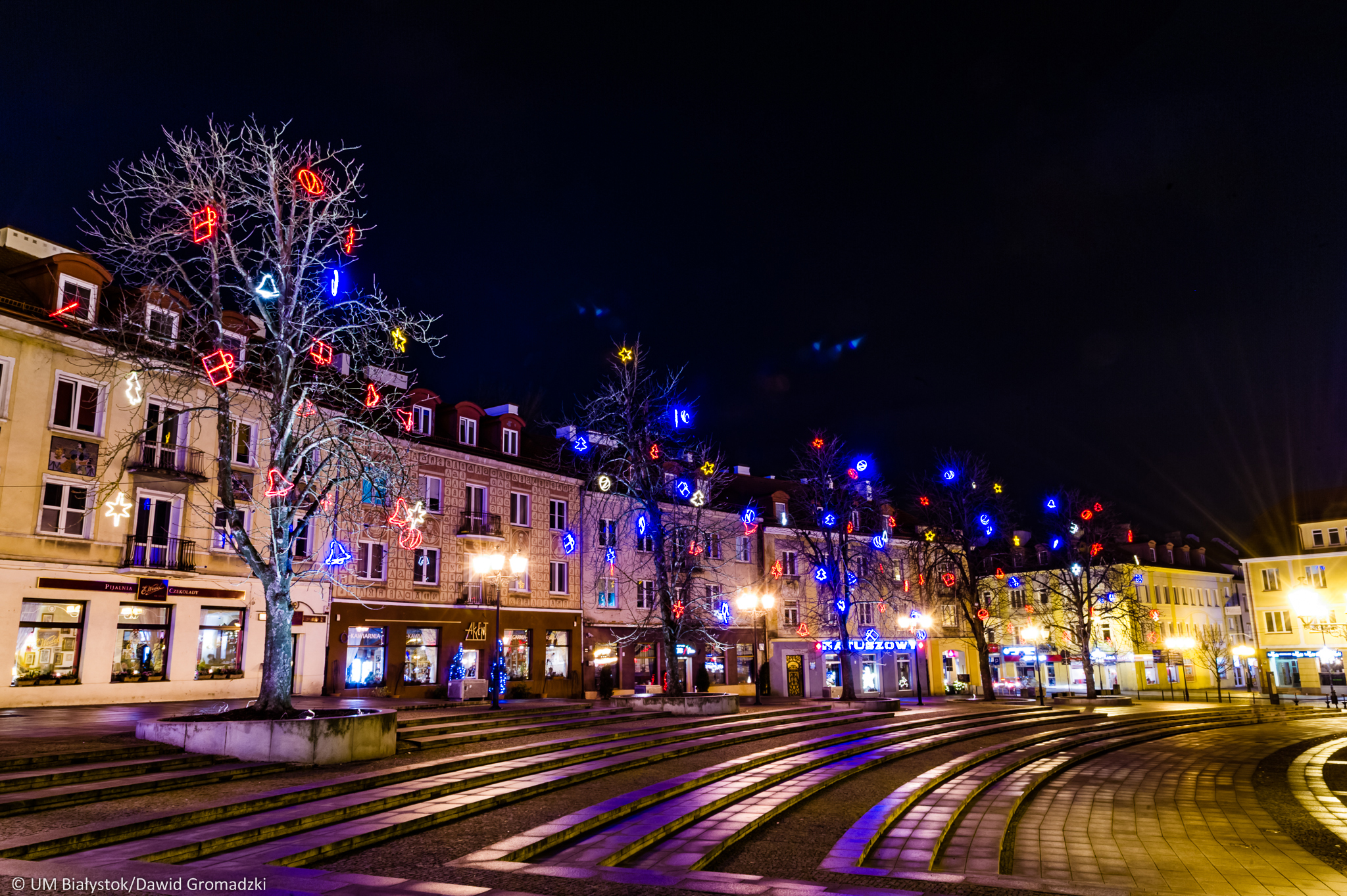 Na Rynku Kościuszki, tuż przy budynku Astorii, jak co roku stanęła miejska choinka. Towarzystwa dotrzymywać jej będą nowe dekoracje świetlne w kształcie prezentu świątecznego, bombki i sań z reniferami – zostaną rozmieszczone w kierunku pomnika Marszałka Józefa Piłsudskiego i kwiaciarni Żonkil. Przy fontannie stanie podświetlony napis #Białystok. Na plac przed Teatr Dramatyczny wrócą postacie z czasów Branickich. Wyjątkowy akcent świąteczny pojawi się w najbardziej rozpoznawalnym miejscu Białegostoku – przy Pałacu Branickich stanie kareta z końmi, zagoszczą tam także postacie Branickich.